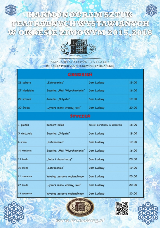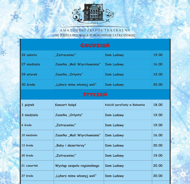 6 stycznia godz.19.00 (środa) „Zatraceniec” - Sztuka teatralna w wykonaniu Amatorskiego Zespołu Teatralnego im. Józefa Pitoraka z Bukowiny Tatrzańskiej.