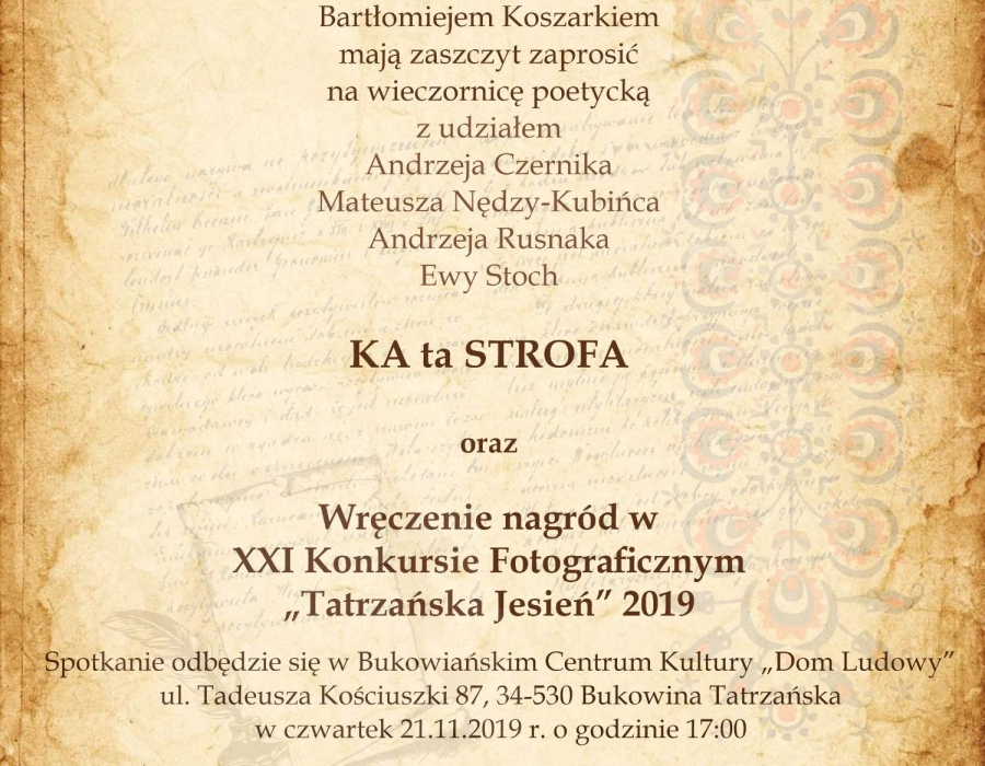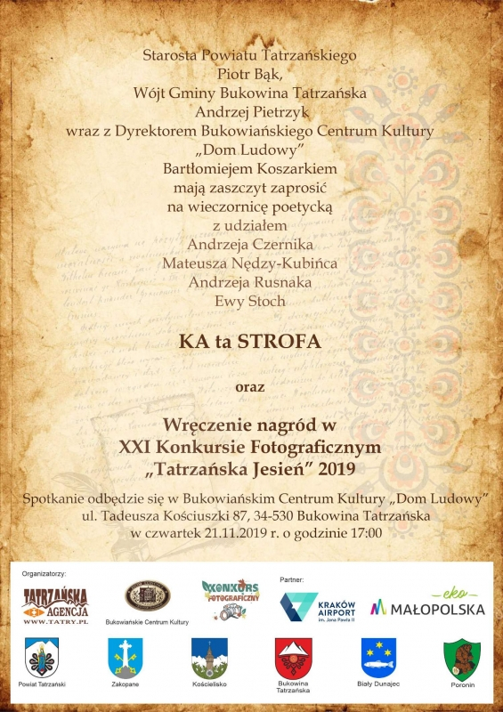 Starosta Powiatu Tatrzańskiego Piotr Bąk, Wójt Gminy Bukowina Tatrzańska Andrzej Pietrzyk wraz z Dyrektorem Bukowiańskiego Centrum Kultury „Dom Ludowy" Bartłomiejem Koszarkiem mają zaszczyt zaprosić na wieczornicę poetycką z udziałem Andrzeja Czernika, Mateusza Nędzy-Kubińca, Andrzeja Rusnaka, Ewy Stoch "KA ta STROFA" oraz Wręczenie nagród w XXI Konkursie Fotograficznym "Tatrzańska Jesień" 2019.